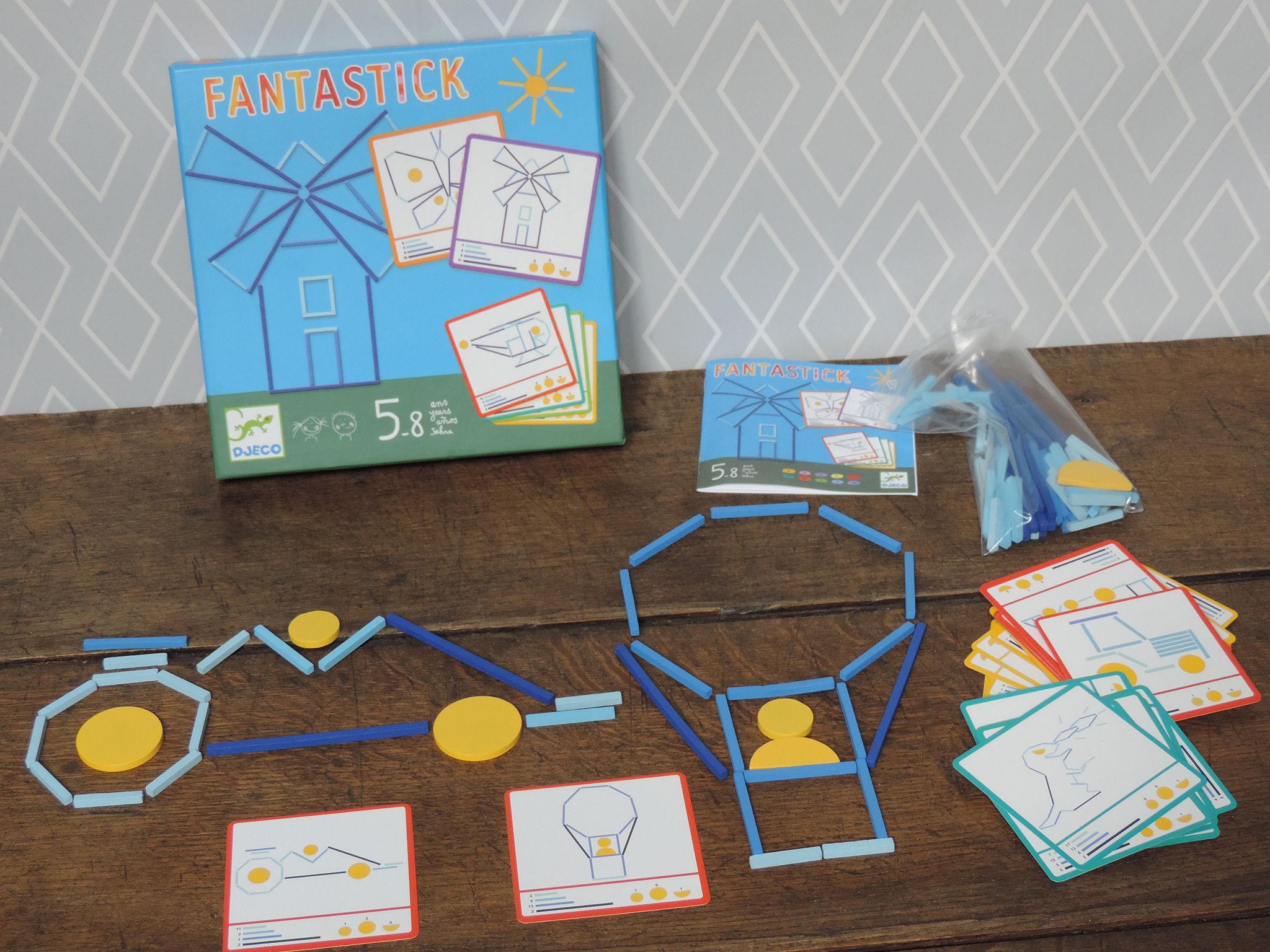 Des bâtonnets et des disques en bois de différentes tailles, des cartes modèles de difficultés croissantes… et de jolies réalisations à venir !