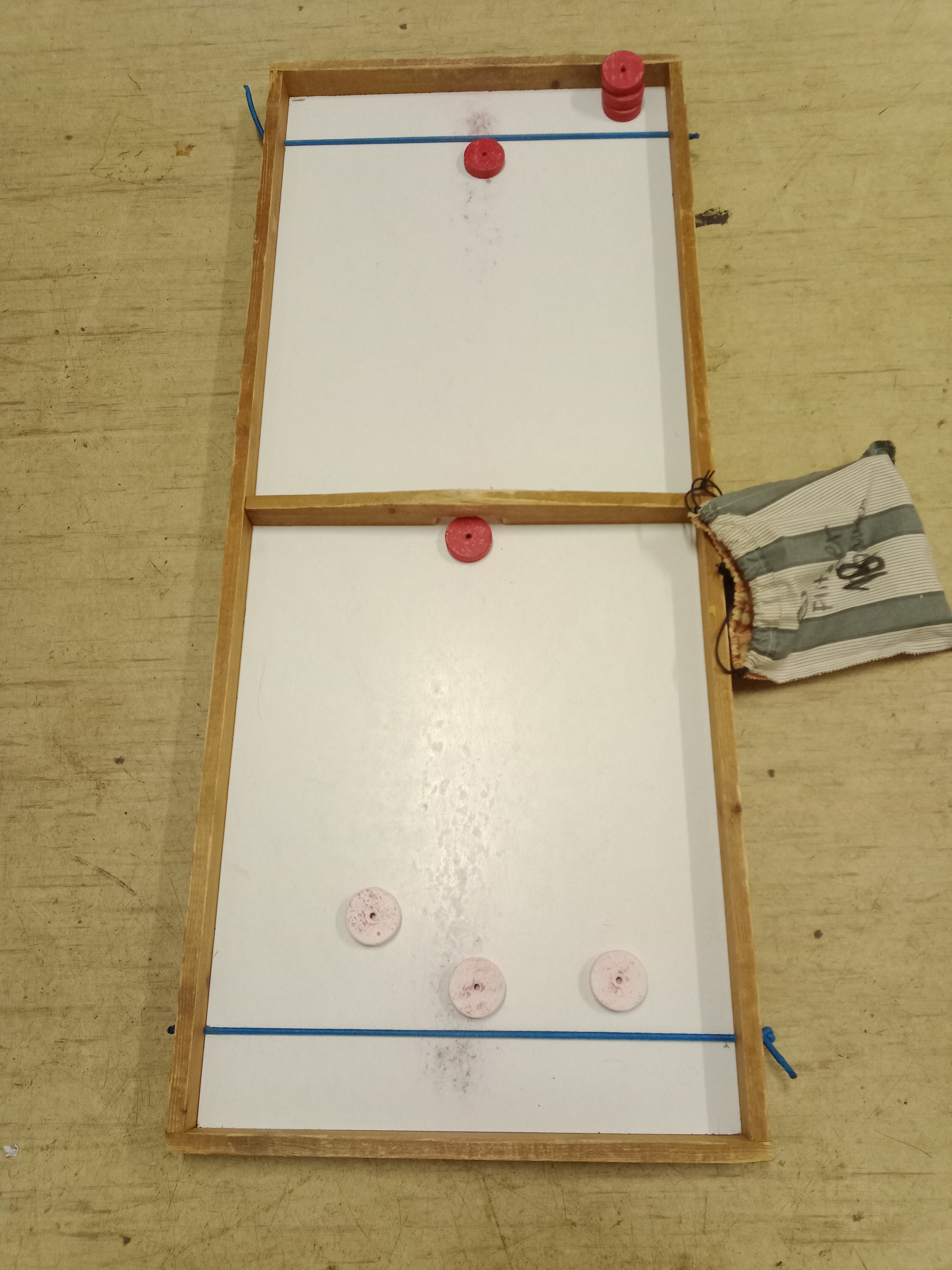 Être le premier à vider son camp de tous les palets. Un plateau de 129 cm par 54 cm