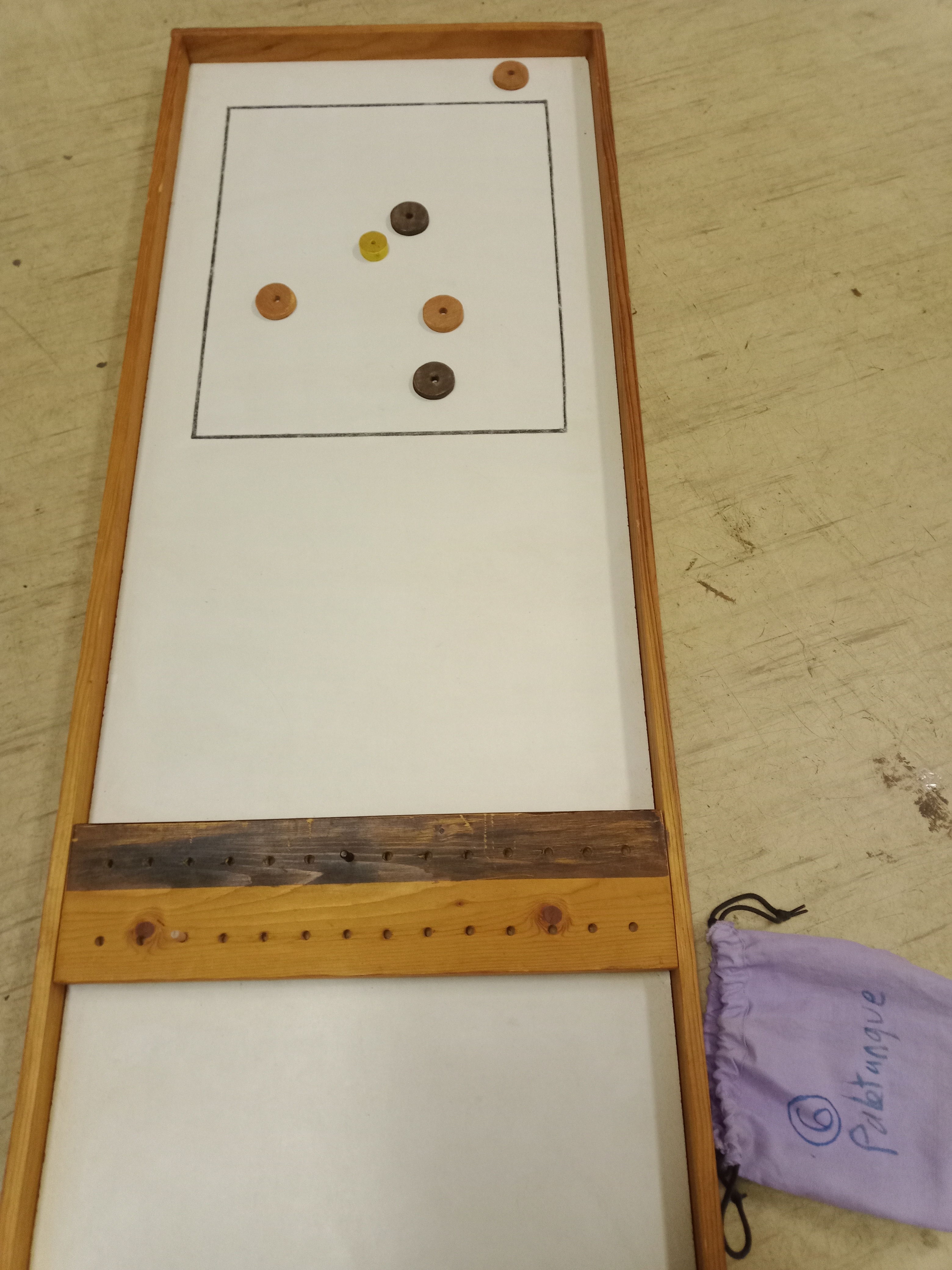 Être le premier à atteindre 10 ou 12 points en se plaçant au plus près du cochonnet. Plateau de 137 cm par 48 cm