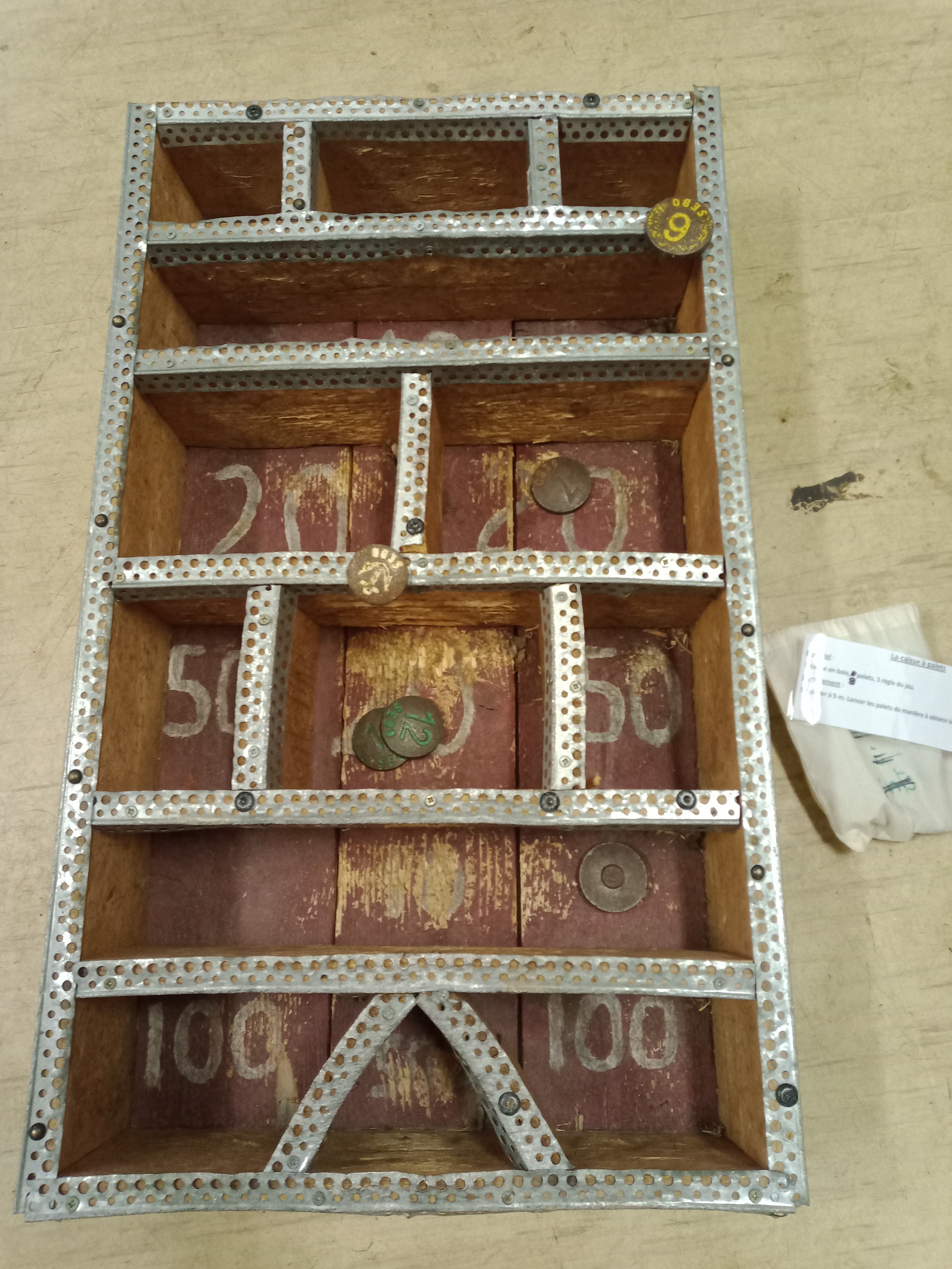 Obtenir le score le plus élevé en lançant ses palets dans les cases. Une caisse de 84 cm par 50 cm (lourd !)